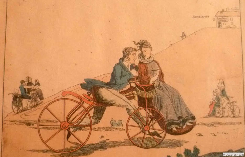 Dans les années 1870 Eugène Meyer, un artisan français, (Allemagne : 1, France : 2) Cocoriiicooo! construit des engins munis d’une roue avant d’un diamètre imposant, selon le principe du tour de roue : il faut agrandir le diamètre pour augmenter la vitesse. Ainsi nait et grandit le grand bi, essentiellement utilisé par des sportifs et la bourgeoisie oisive de Bagatelle, au bois de Boulogne. Côté sport, ça roule déjà fort : on a vu des sprints à plus de 30 kmh. Peu à peu, le grand bi bois est remplacé par le grand bi acier. Vers 1875, le français Jules Truffault (Allemagne : 1,
