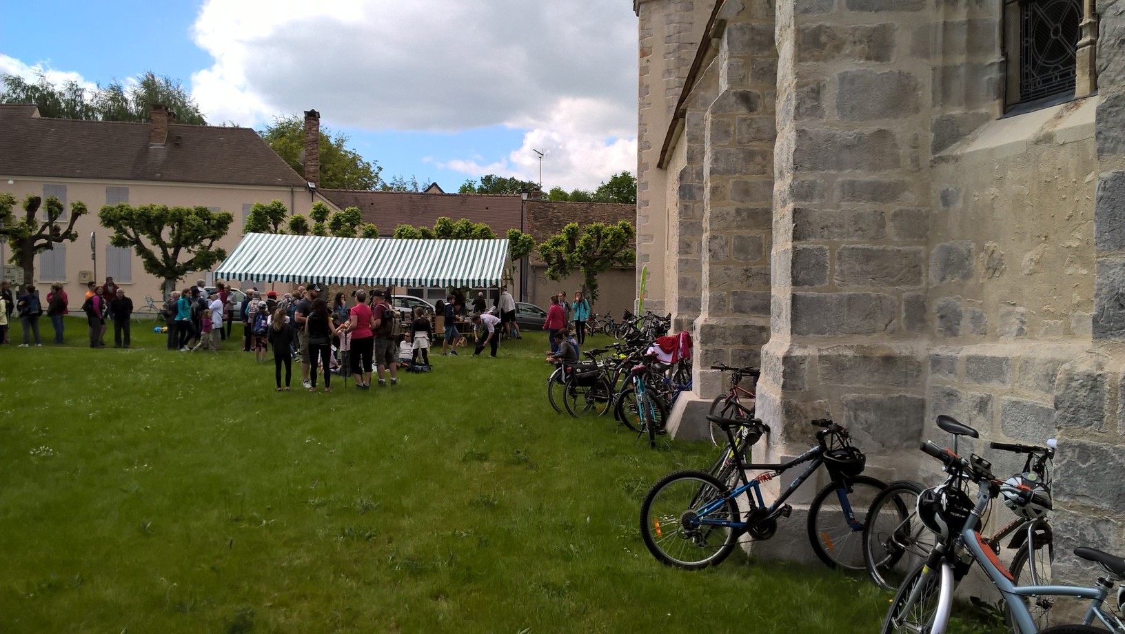 La seule portion de « plat » de cette sortie aura duré 3 kilomètres : un chemin de halage le long de la Sambre, où nous avons pu admirer un dinosaure – heureusement, il était sur l'autre rive de la rivière. Juste avant le premier ravitaillement, une halte à l'office de tourisme de Beaumont où j'ai veillé à ce que Pascal B. prenne bien SON vélo, et non l'un de ceux à assistance électrique garés à côté des nôtres (voir photo).