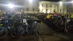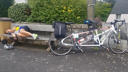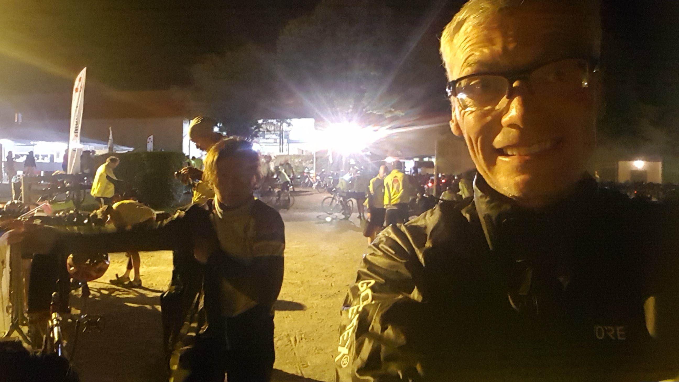 Nous commençons cependant à maudire la personne qui a élaboré ce parcours. Nous avons l’impression que toutes les bosses du coin y passent, tel un parcours noir à la Daniel le dimanche matin, mais en version prolongée. Tout au long des étapes, des cyclos sont allongés à l’entrée d’un champ, sur un coin d’herbe, ou sur un banc lorsqu’il ne leur a pas été possible d’atteindre la commune suivante. La nuit, les sas de banque sont pris d’assaut. Ma lampe me fait apparaitre au dernier moment le gilet réfléchissant des cyclos qui s’affalent dans l’herbe humide au cœur des nuits froides. Les habitants eux-mêmes proposent parfois des couchages chez eux. Quatre pieds qui dépassent de l’arrière d’une camionnette mise à disposition, portes grandes ouvertes, nous font penser à deux macchabés. Toutes ces situations burlesques nous font rire et animent notre progression. On n'est pas si mal comparés à d’autres !