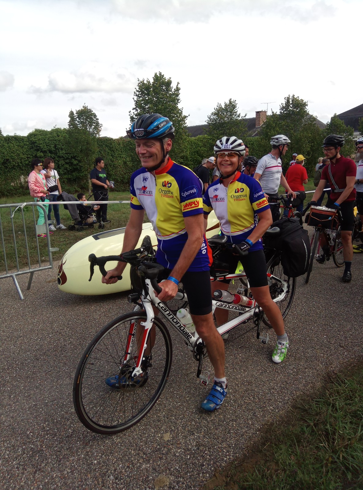 Sous le soleil réapparu en milieu d’après-midi, effaçant 2 jours de pluie discontinue les 48 heures précédant le départ, nous avalons les premiers kilomètres sur une route sèche. Le groupe des vélos spécifiques aux allures bien différentes les uns des autres s’étirent rapidement, et nous nous retrouvons vite à rouler en prenant le vent. Les vélomobiles nous doublent à une allure vertigineuse, je regarde avec admiration les vélos d’exception participant au concours des machines ainsi que les vélos les plus atypiques : tricycles, vélos couchés, triplette ... De nombreux tandems sont également présents. Le parcours roulant et l’excitation du départ nous font aller à bonne allure. Deux copains nous suivent en vélo sur ces premiers kilomètres et nous saluons amis et connaissances venus nous saluer sur le bord de la route. Beaucoup de monde applaudit et encourage les participants. Un arrêt minute à Condé-sur-Vesgre où l’UVO et d’autres amis se sont regroupés pour nous souhaiter bonne route.