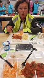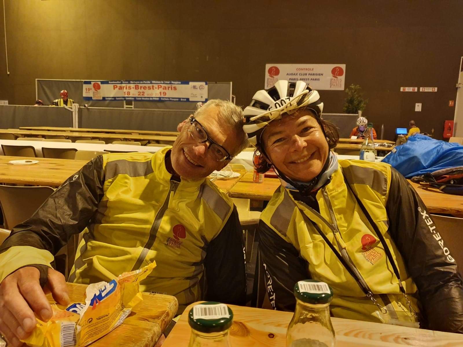 De retour à Carhaix, après avoir tamponné notre carnet de route, nous accédons à la cantine en zigzaguant autour des cyclos allongés à terre à l’intérieur du bâtiment. Parfois sous une couverture de survie ou emmitouflés dans leurs habits. La fatigue se lit sur tous les visages. Les bénévoles nous guident avec une grande gentillesse. L’état de certains semble néanmoins effrayer les plus jeunes d’entre eux. Nous mangeons et nous nous affalons sur la table comme beaucoup d’autres durant au moins vingt minutes. Tout autour des tables les cyclos s’endorment à terre. Nos vêtements sont bien marqués par l’effort physique et on enverrait bien valdinguer le cuissard. Le maillot chaud pour la nuit, dont on ne sent que trop bien l’odeur à chaque fois que nous le mettons ou l’enlevons, nous dégoute un peu. Rambouillet nous semble encore si loin. Il reste 2 nuits et 1 journée à passer !