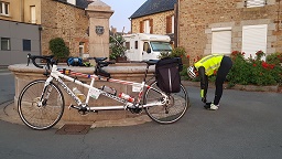 Nous traversons la Mayenne puis entrons rapidement en Bretagne à l’approche de la jolie ville de Fougères que nous atteignons au lever du jour. Les bosses se font plus présentes. Nous rangeons nos affaires de nuit, la journée va être ensoleillée. La petite étape de 54 km nous amenant à Tinténiac nous fait rentrer dans le vif du sujet. Les bouts de plat disparaissent pour laisser place à une succession de montées et de descentes à n’en plus finir. La suite nous fera vite comprendre que nous ne sommes qu’au début des véritables difficultés qui vont se présenter à nous. Nos fesses sont soumises à rude effort dans ces ascensions, et commencent à poindre les premières gênes qui nous font dandiner sur la selle.
